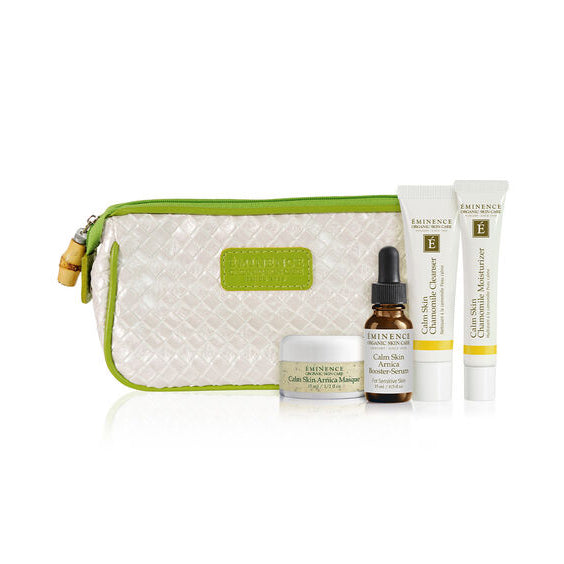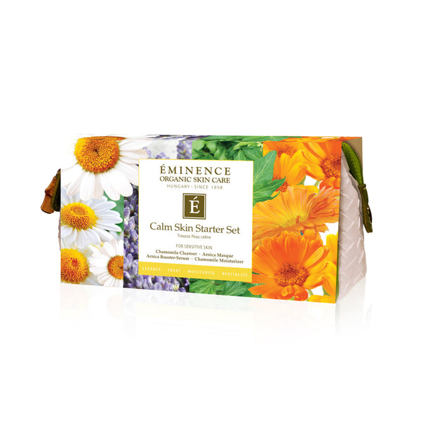 Ce kit de démarrage "Calm skin"  éminence est joliment emballé avec un approvisionnement d'un mois de produits biologiques ciblés pour traiter les types de peau sensibles.